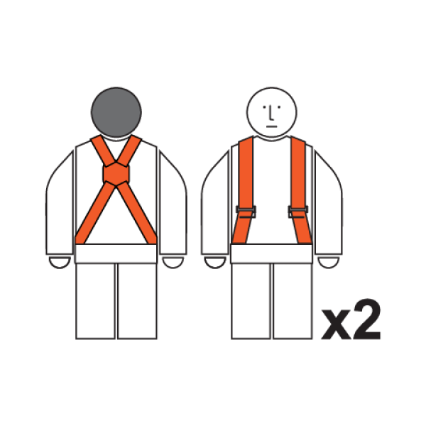W zestawie 2 pasy-szelki ze stalowymi klamrami zakładane na plecy i 2 pasy podtrzymujące ładunek. Możliwe trzy opcje połączeń długości.