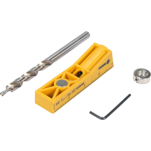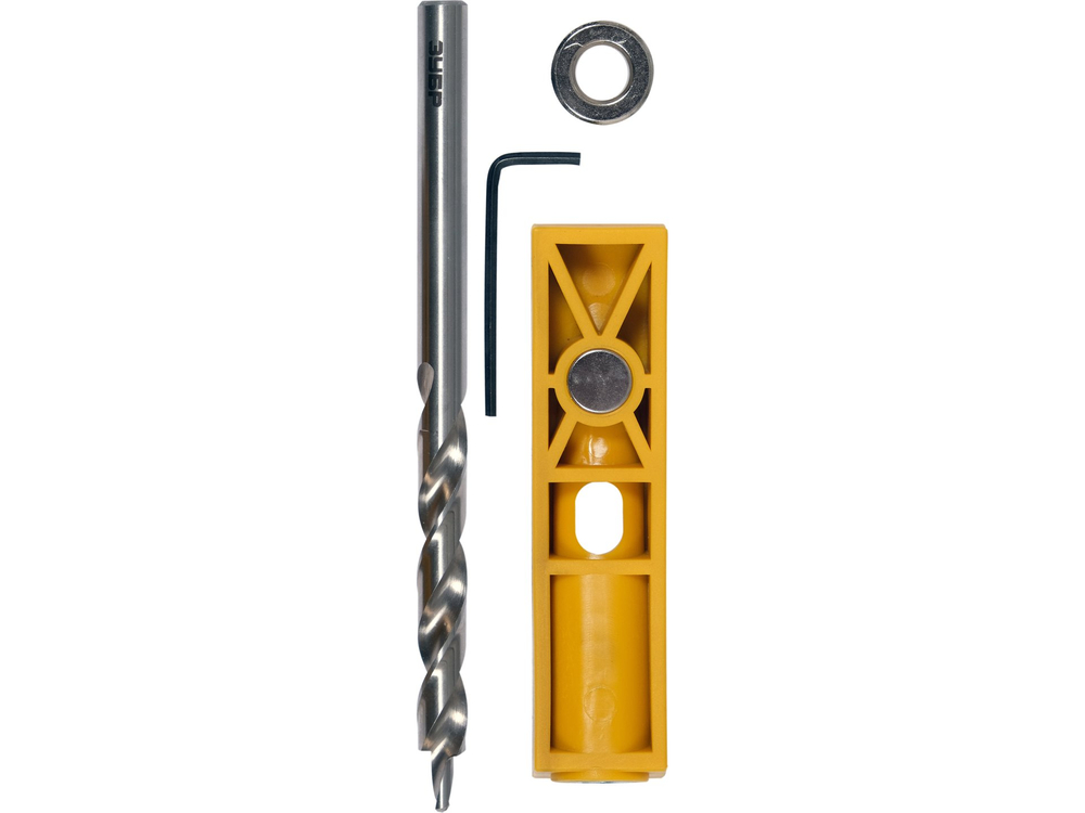 prowadnica z tulejowanym ukośnym otworem na wiertło, wiertło stoczone, ogranicznik głębokości wiercenia, klucz imbusowy do blokowania ogranicznika