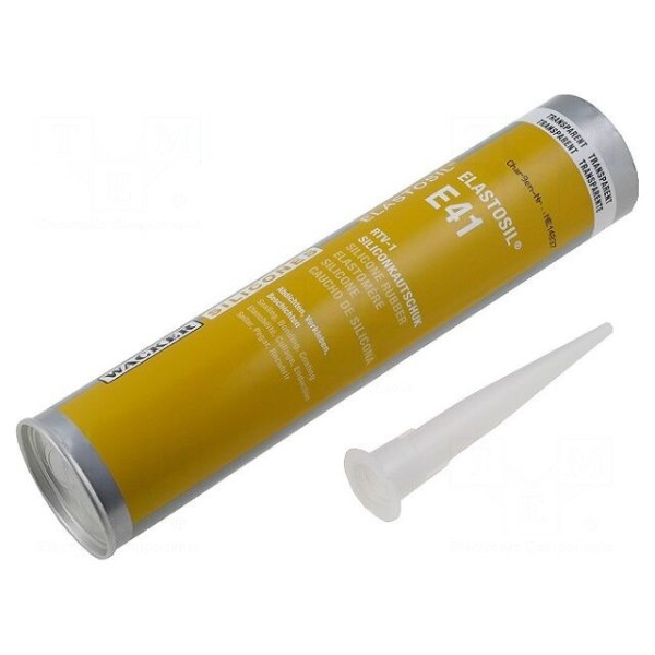 ELASTOSIL E41 to bezbarwna guma silikonowa o gęstości 1,09g/cm³ w temperaturze 20°C. Preparat utwardza się w temperaturze pokojowej (RTV), wykazując czas schnięcia wynoszący 20 minut, przy pełnym czasie wiązania określonym na 24 godziny.