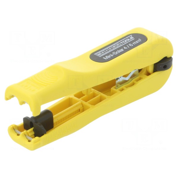 Narzędzie przeznaczone jest do usuwania izolacji z przewodów solarnych o przekrojach 4mm² oraz 6mm². Konstrukcja umożliwia precyzyjne przygotowanie końcówek kabli stosowanych w instalacjach fotowoltaicznych.