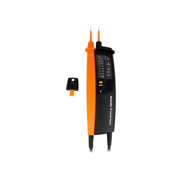 Tester elektryczny COMBICHECK służy do pomiaru napięcia stałego oraz przemiennego. Urządzenie obsługuje szeroki zakres napięć wejściowych, obejmujący wartości 6V, 12V, 24V, 50V, 120V, 230V, 400V oraz 690V. Pomiar napięcia AC realizowany jest w paśmie częstotliwości od 0 do 100Hz.