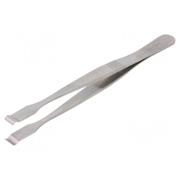 Konstrukcja narzędzia opiera się na zastosowaniu stali nierdzewnej, co wpływa na jego trwałość. Pęseta posiada szerokie ostrza wykończone końcówką w kształcie haka, co ułatwia manipulację elementami w układach montowanych powierzchniowo.