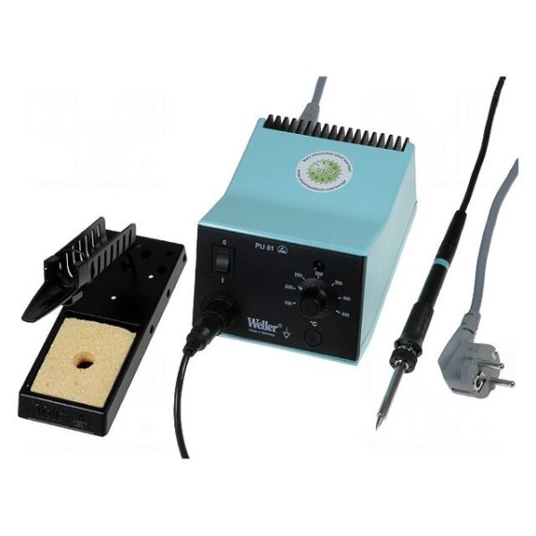 W zestawie znajdują się: stacja WEL.PU81, lutownica WEL.WSP80, podstawka pod lutownicę, gąbka do czyszczenia grotów oraz grot WEL.LT-B. Urządzenie jest przystosowane do pracy w krajach europejskich, co potwierdza odpowiedni standard złącza zasilania. Konstrukcja stacji zapewnia stabilność parametrów pracy podczas lutowania elementów elektronicznych.