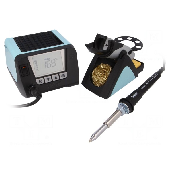 Jednokanałowa stacja lutownicza WELLER o mocy 150W wyposażona jest w lutownicę o mocy 200W. Urządzenie pozwala na pracę w zakresie temperatur od 50°C do 550°C przy stabilności temperaturowej wynoszącej ±2°C oraz dokładności ±9°C. Regulacja temperatury odbywa się w sposób cyfrowy za pomocą przycisków, a bieżące parametry pracy prezentowane są na wyświetlaczu LCD.