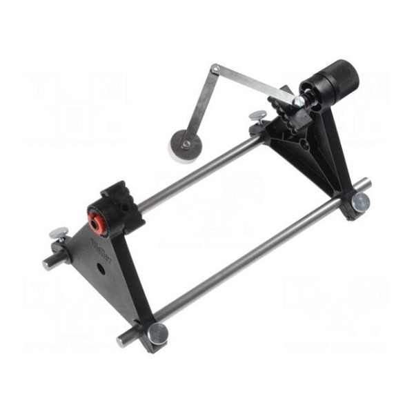Wyposażenie obejmuje dwa ruchome uchwyty wykonane z tworzywa oraz dedykowane ramię dociskające, które zapewnia właściwe pozycjonowanie materiału. Gumowe podstawki zastosowane w podstawie uchwytu gwarantują stabilność podczas wykonywania czynności montażowych lub serwisowych.