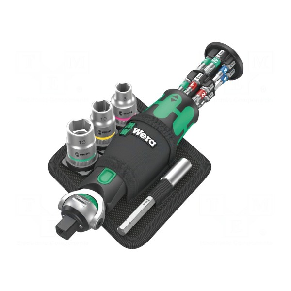 W zestawie: etui, końcówki wkrętakowe, nasadki 6-kątne, przedłużacz 1/4" o długości 75 mm. Zastosowane rozwiązania techniczne pozwalają na wykorzystanie narzędzia w różnorodnych pracach montażowych i serwisowych wymagających częstej zmiany końcówek.