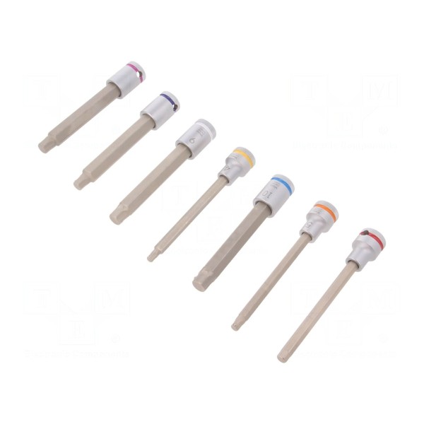Zestaw zawiera 7 kluczy nasadowych typu imbus przeznaczonych do pracy z uchwytami o rozmiarze 3/8". Komplet obejmuje nasadki o następujących wymiarach grota: HEX 4mm, HEX 5mm, HEX 6mm, HEX 7mm, HEX 8mm, HEX 9mm oraz HEX 10mm.