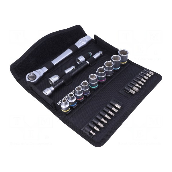 Zestaw kluczy nasadowych obejmuje 29 elementów przystosowanych do pracy z gniazdami 3/8". Komplet zawiera grzechotkę Zyklop Metal, zestaw końcówek nasadowych oraz końcówek wkrętakowych o różnych profilach, w tym imbus, Phillips, Pozidriv oraz Torx. Zróżnicowane rozmiary końcówek wkrętakowych obejmują typy PH1, PH2, PH3, PZ1, PZ2 oraz TX15, TX20, TX25, TX27, TX30 i TX40.