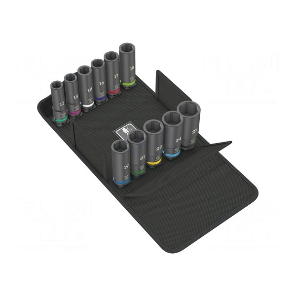 Klucze wyposażono w kod kolorystyczny, który ułatwia szybkie rozpoznanie wymaganego rozmiaru podczas pracy. Zestaw jest dostarczany w etui, które zabezpiecza narzędzia i ułatwia ich przechowywanie oraz organizację. Elementy przeznaczone są do współpracy z narzędziami udarowymi.