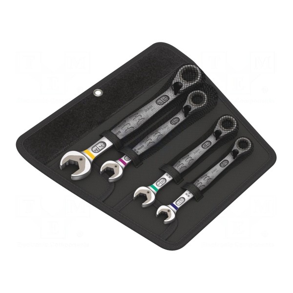 Zestaw zawiera cztery klucze płasko-oczkowe wyposażone w mechanizm grzechotkowy. Narzędzia posiadają przełącznik kierunku pracy, co ułatwia obsługę w miejscach o ograniczonej przestrzeni roboczej.