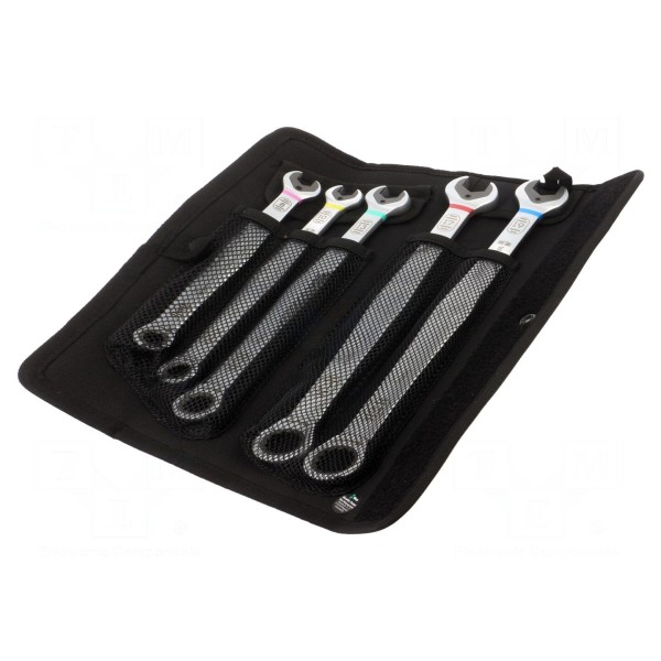 Zestaw zawiera pięć kluczy płasko-oczkowych wyposażonych w mechanizm grzechotkowy. W komplecie znajdują się narzędzia o rozmiarach 8 mm, 10 mm, 13 mm, 17 mm oraz 19 mm.