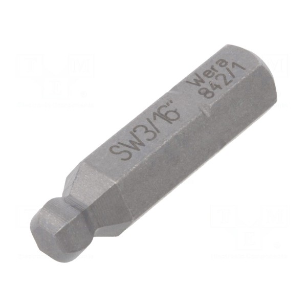Końcówka wkrętakowa typu imbus kulisty o rozmiarze HEX 3/16". Element wyposażony jest w uchwyt o średnicy 1/4" (D6,3mm).