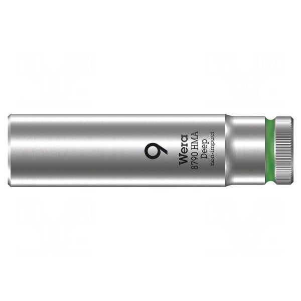 Nasadka 6-kątna typu nasadowego o rozmiarze 9 mm przeznaczona jest do pracy z uchwytami o rozmiarze 1/4". Element charakteryzuje się długością całkowitą wynoszącą 50 mm, co umożliwia dostęp do głębiej osadzonych śrub.
