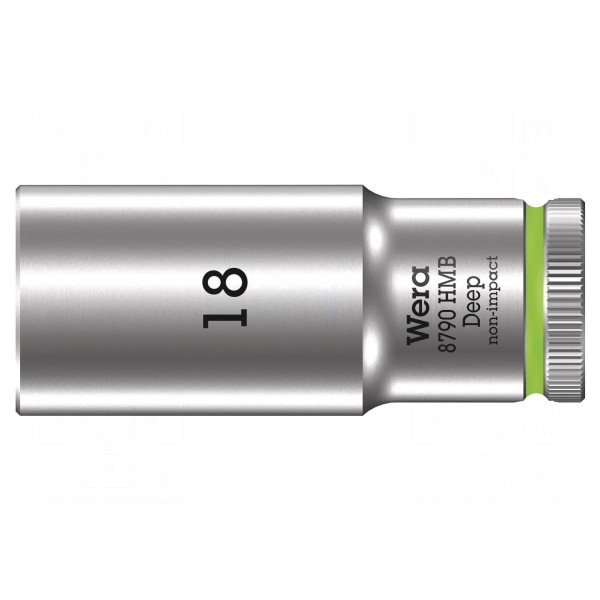 Nasadka sześciokątna typu nasadowego o rozmiarze 18 mm została wykonana ze stali chromowo-wanadowej. Narzędzie przeznaczone jest do współpracy z kluczami posiadającymi gniazdo montażowe o rozmiarze 3/8 cala.