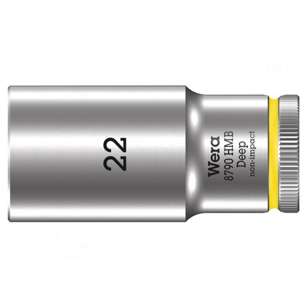 Nasadka sześciokątna typu nasadowego o rozmiarze 22 mm została wykonana ze stali chromowo-wanadowej. Narzędzie jest przeznaczone do współpracy z uchwytami o rozmiarze 3/8 cala.