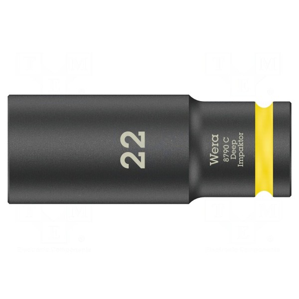 Nasadka udarowa typu 6-kątnego przeznaczona jest do pracy z połączeniami śrubowymi o rozmiarze 22 mm. Element charakteryzuje się konstrukcją przystosowaną do obciążeń udarowych oraz długim korpusem o całkowitym wymiarze 83 mm.