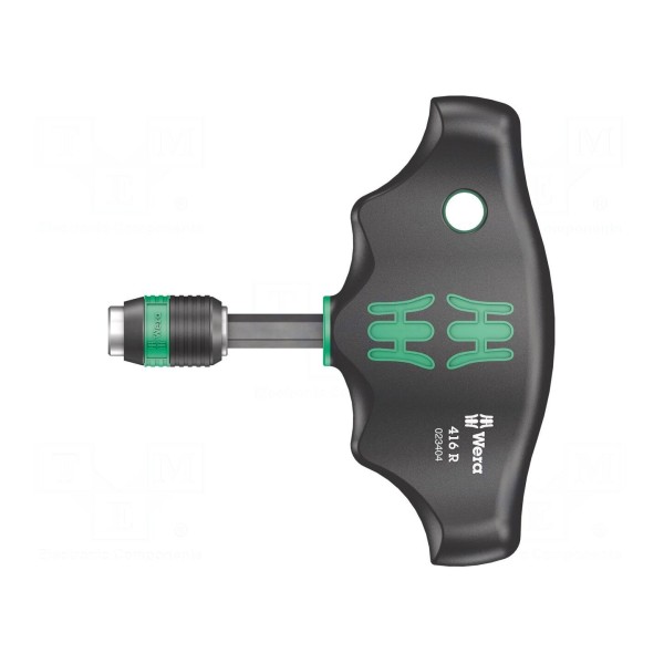 Rękojeść wkrętakowa typu T przeznaczona jest do pracy z grotami o rozmiarze 1/4". Narzędzie wyposażone jest w gniazdo sześciokątne, obsługujące standardy uchwytów C6,3mm oraz E6,3mm.