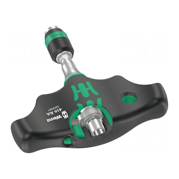 Rękojeść wkrętakowa typu T wyposażona w mechanizm grzechotkowy umożliwia pracę z wymiennymi końcówkami wkrętakowymi. Narzędzie obsługuje gniazda o rozmiarze 1/4" oraz standardy uchwytów C6,3 i E6,3, co zapewnia kompatybilność z szerokim zakresem bitów.