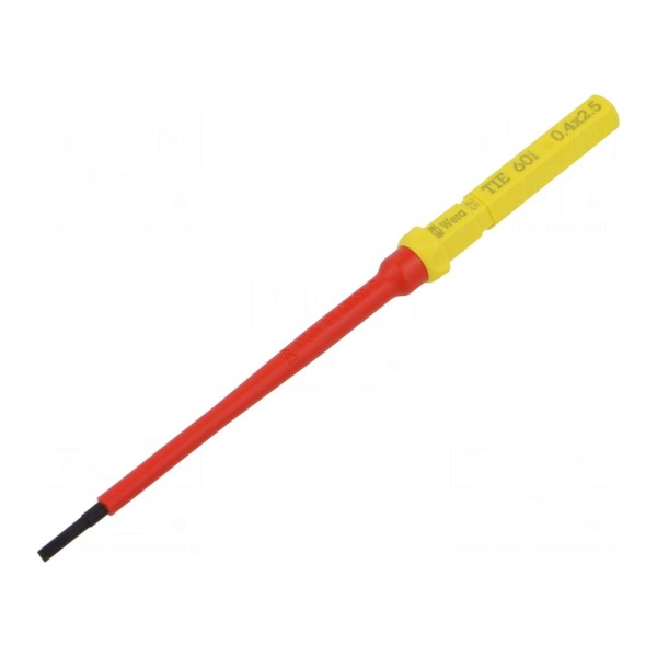 Trzon wymienny typu płaskiego o wymiarach grota 2,5x0,4mm został zaprojektowany do prac pod napięciem. Element charakteryzuje się długością całkowitą wynoszącą 157mm oraz sześciokątnym profilem uchwytu o rozmiarze 9mm.