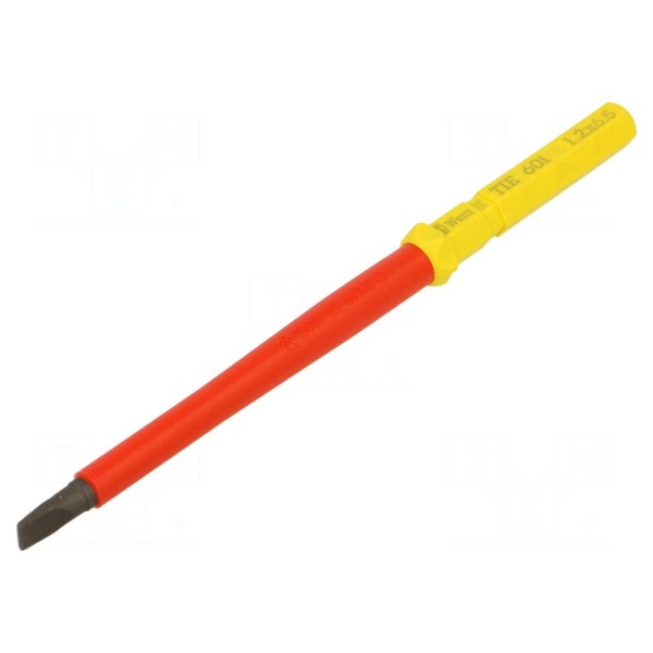 Trzon wymienny WERA typu Kraftform Kompakt VDE 60 i to izolowany element przeznaczony do prac pod napięciem do 1kV AC. Grot o profilu płaskim posiada wymiary 6,5x1,2mm, a jego całkowita długość wynosi 157mm.