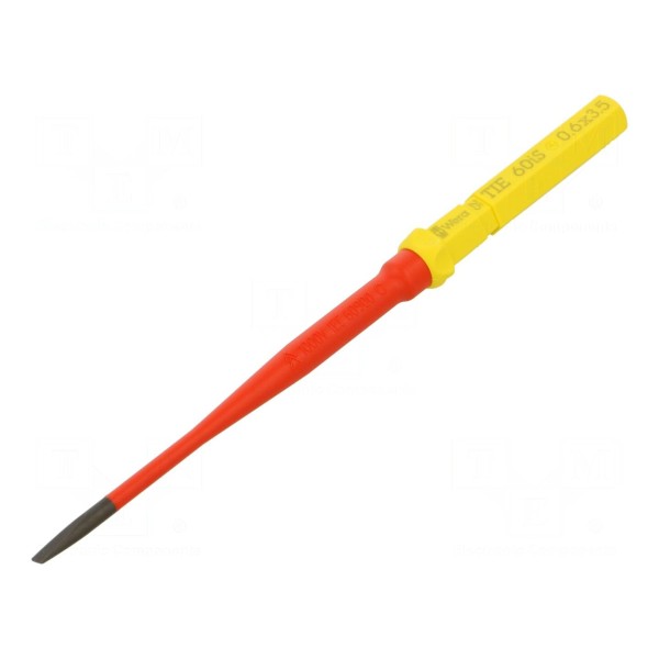 Trzon wymienny typu płaskiego przeznaczony jest do prac pod napięciem do 1kV AC. Element charakteryzuje się zredukowaną średnicą izolacji typu slim, co umożliwia dostęp do głęboko osadzonych śrub i elementów sprężynowych. Wymiary grota wynoszą 3,5x0,6mm przy całkowitej długości narzędzia 157mm.