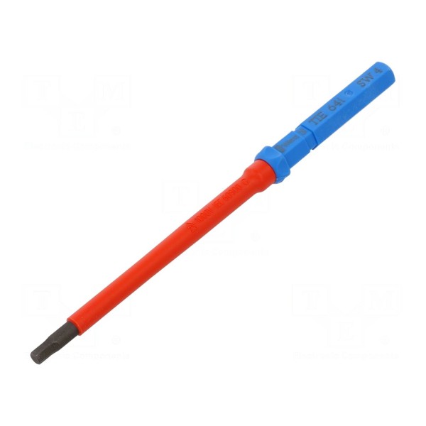 Trzon wymienny izolowany z końcówką typu imbus Hex-Plus o rozmiarze 4mm przeznaczony jest do prac pod napięciem do 1kV AC. Element charakteryzuje się sześciokątnym profilem uchwytu o średnicy 9mm, co pozwala na stabilne mocowanie w kompatybilnych systemach rękojeści.
