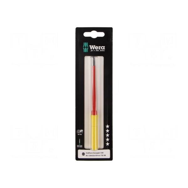 Trzon wymienny izolowany o profilu płaskim z serii Kraftform Kompakt VDE przeznaczony jest do prac pod napięciem do 1kV AC. Element posiada wymiary grota 3,5x0,6mm oraz całkowitą długość wynoszącą 157mm.