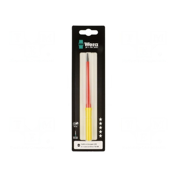 Trzon wymienny WERA typu Kraftform Kompakt VDE 60 i wyposażony jest w grot płaski o rozmiarze 4x0,8 mm. Narzędzie zostało zaprojektowane jako element izolowany, co umożliwia pracę przy instalacjach elektrycznych pod napięciem do 1kV AC.