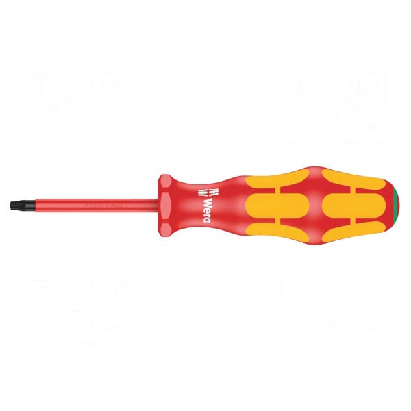 Wkrętak izolowany marki WERA przeznaczony jest do prac pod napięciem do 1kV AC. Narzędzie wyposażone jest w grot typu Torx w rozmiarze TX20 wykonany ze stali. Długość robocza ostrza wynosi 80mm, przy całkowitej długości narzędzia równej 178mm.