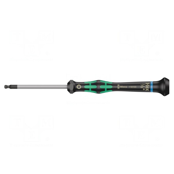 Precyzyjny wkrętak wyposażony w grot typu imbus z końcówką kulistą o rozmiarze HEX 1/8". Długość ostrza wynosi 60 mm, a wymiar całkowity narzędzia to 157 mm.