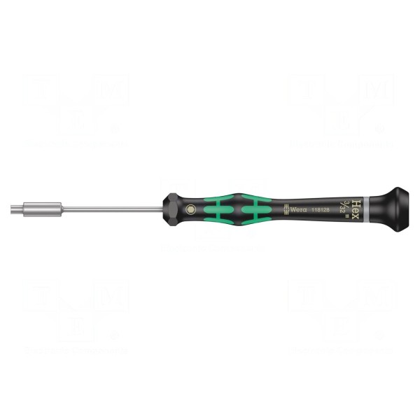 Wkrętak precyzyjny wyposażony w nasadkę 6-kątną o rozmiarze HEX 3/32". Narzędzie posiada ostrze o długości 60 mm, a jego długość całkowita wynosi 157 mm.