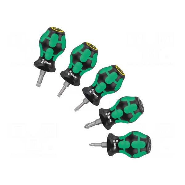 Zestaw zawiera pięć wkrętaków o krótkiej konstrukcji typu Stubby, przeznaczonych do pracy w ograniczonych przestrzeniach. Komplet obejmuje narzędzia z końcówkami płaskimi w rozmiarach 3,5x0,6mm, 4x0,8mm oraz 5,5x1mm, a także wkrętaki z końcówkami Pozidriv w rozmiarach PZ1 i PZ2.