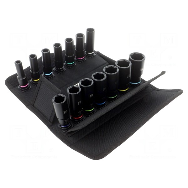 W skład zestawu wchodzą końcówki o rozmiarach: 8 mm, 10 mm, 11 mm, 12 mm, 13 mm, 14 mm, 15 mm, 16 mm, 17 mm, 18 mm, 19 mm, 21 mm, 22 mm oraz 24 mm. Dzięki różnorodności wymiarów, zestaw znajduje szerokie zastosowanie w pracach montażowych i serwisowych wymagających użycia kluczy udarowych. W zestawie: końcówki nasadowe 3/8".