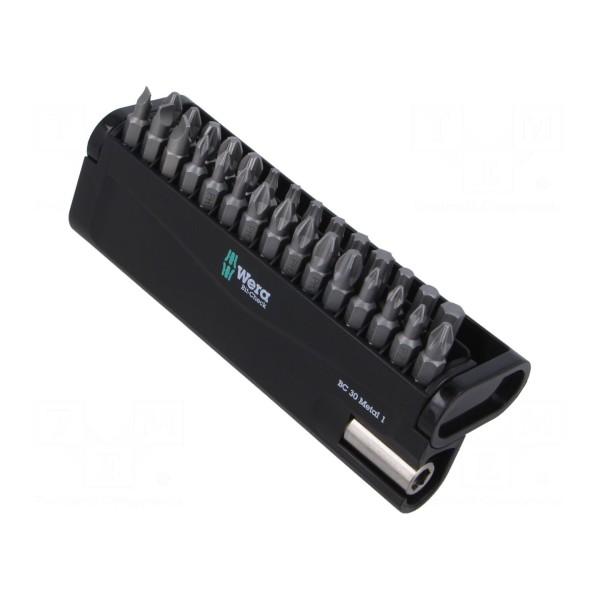 Zestaw zawiera 30 elementów, w tym końcówki wkrętakowe o różnych rodzajach grotów: imbus Hex-Plus, Phillips, płaski, Pozidriv oraz Torx. Narzędzia posiadają standardowy uchwyt C6,3mm (1/4") i cechują się długością całkowitą wynoszącą 25mm.
