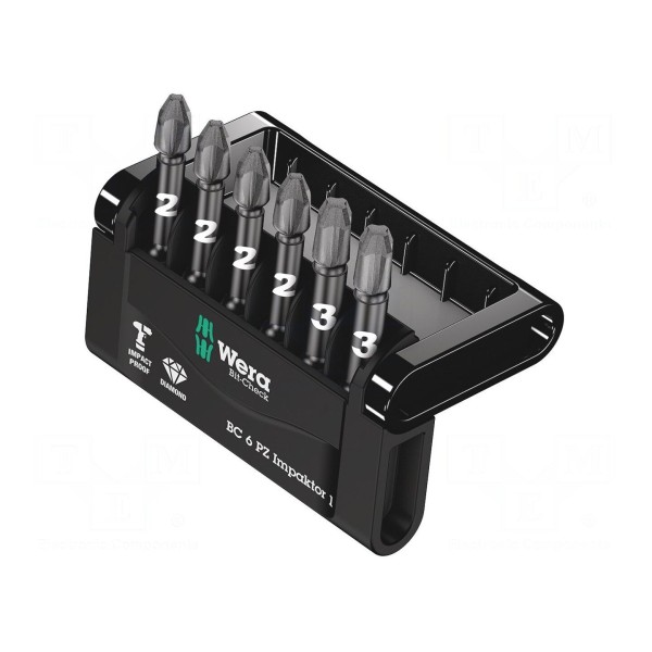 Zestaw zawiera sześć udarowych końcówek wkrętakowych typu Pozidriv z gniazdem uchwytu 1/4". Elementy te posiadają powłokę diamentową, która zwiększa parametry użytkowe narzędzi podczas pracy z wkrętami.