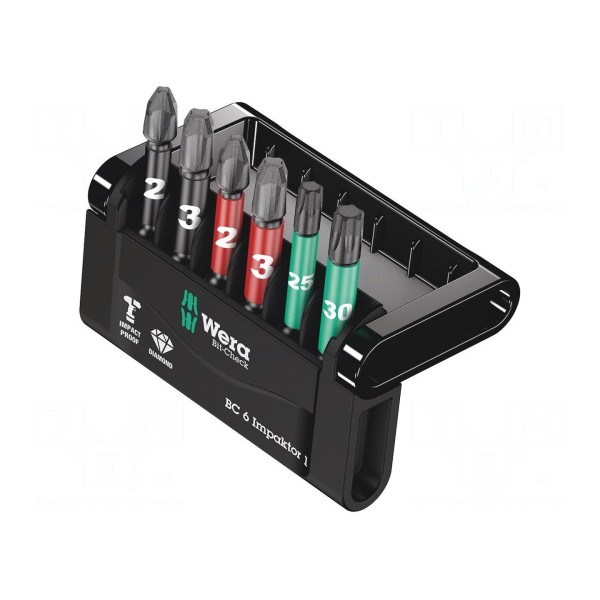 Zestaw końcówek wkrętakowych zawiera 6 elementów o długości całkowitej 50 mm. W komplecie znajdują się groty typu Phillips, Pozidriv oraz Torx w rozmiarach PH2, PZ2, PH3, PZ3, TX25 oraz TX30.