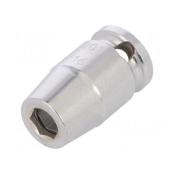 Adapter narzędziowy o całkowitej długości 30 mm służy do obsługi końcówek wkrętakowych. Element posiada gniazdo uchwytu w standardzie D8 o rozmiarze 5/16" oraz gniazdo wyjściowe o rozmiarze 3/8".