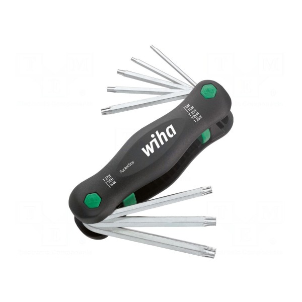 Zestaw zawiera osiem kluczy typu Torx z otworem zabezpieczającym w rozmiarach T9H, T10H, T15H, T20H, T25H, T27H, T30H oraz T40H. Narzędzia te przeznaczone są do pracy z wkrętami wyposażonymi w trzpień blokujący, co rozszerza możliwości ich zastosowania w różnorodnych mechanizmach.