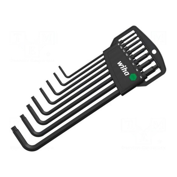 Zestaw zawiera osiem kluczy typu Torx o rozmiarach TX9, TX10, TX15, TX20, TX25, TX27, TX30 oraz TX40. Narzędzia zostały wykonane ze stali chromowo-wanadowej, co zapewnia ich wytrzymałość podczas pracy ze śrubami o odpowiednim gnieździe.