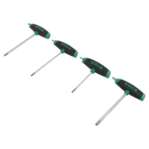 Zestaw zawiera sześć kluczy typu Torx o rozmiarach TX10, TX15, TX20, TX25, TX30 oraz TX40. Narzędzia wyposażone są w rękojeść typu T, co wpływa na ergonomię pracy podczas dokręcania i odkręcania śrub z gniazdem typu gwiazdka.