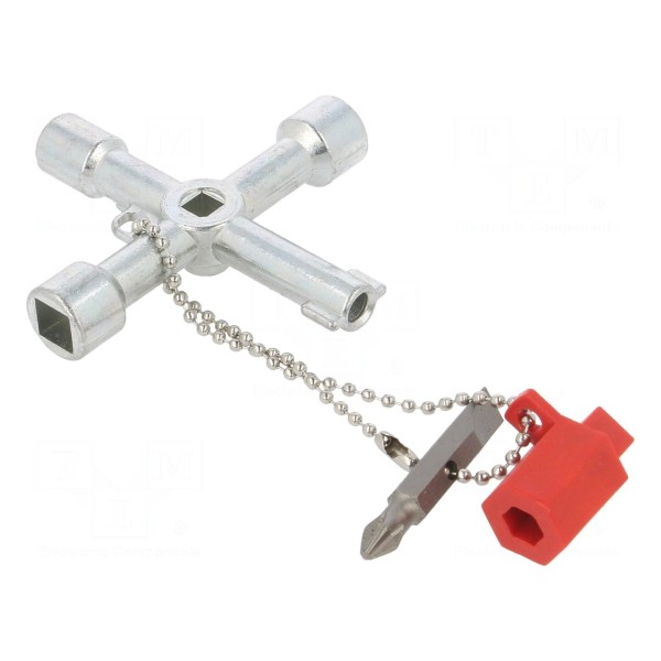 Klucz do szaf sterowniczych o długości 76 mm wyposażony jest w specjalistyczne końcówki: kwadrat 5-8 mm, ostrosłup 3-5 mm oraz trójkąt 9 mm. Narzędzie przeznaczone jest do obsługi systemów klimatyzacji, regałów magazynowych oraz szaf sterowniczych.