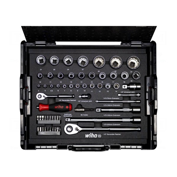 Prezentowany zestaw narzędzi składa się z 60 elementów przeznaczonych do prac z połączeniami śrubowymi. W skład pakietu wchodzą klucze nasadowe o profilu 6-kątnym, które zapewniają przenoszenie momentu obrotowego na łeb śruby.