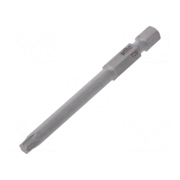Końcówka wkrętakowa typu Torx o rozmiarze grota TX25 przeznaczona jest do pracy z wkrętami z gniazdem gwiazdkowym. Element wyposażony jest w uchwyt o standardzie E6,3mm, co odpowiada rozmiarowi 1/4". Całkowita długość narzędzia wynosi 70mm.