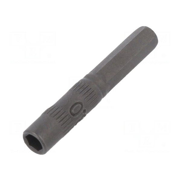 Końcówka wkrętakowa typu nasadka 6-kątna została wykonana ze stali chromowo-wanadowej, co zapewnia wytrzymałość materiałową podczas pracy. Element charakteryzuje się hartowaną powierzchnią zwiększającą trwałość użytkową narzędzia.