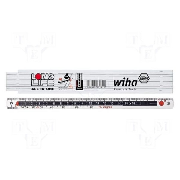 Miarka składana o długości 2m i szerokości 15mm wykonana jest z poliamidu wzmocnionego włóknem szklanym. Narzędzie umożliwia precyzyjny pomiar długości oraz kąta dzięki blokadzie wszystkich przegubów w pozycji 90°. Skala odczytu podawana jest w jednostkach metrycznych z najmniejszą podziałką wynoszącą 1mm.