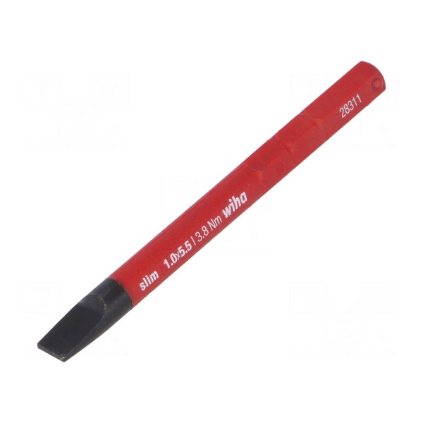 Trzon wymienny ElectricVario to izolowane narzędzie z grotem płaskim o wymiarach 5,5x1mm, przeznaczone do prac pod napięciem do 1kV AC. Element został wykonany ze stali chromowo-molibdenowej, która poddana została procesom hartowania oraz czernienia dla zwiększenia trwałości. Całkowita długość trzonu wynosi 75mm.