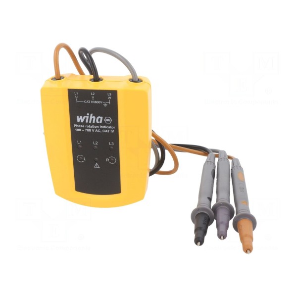 Tester kolejności faz WIHA 45221 służy do określania kierunku wirowania faz w układach elektrycznych. Urządzenie obsługuje zakres napięć międzyfazowych wynoszący od 100V do 700V AC.