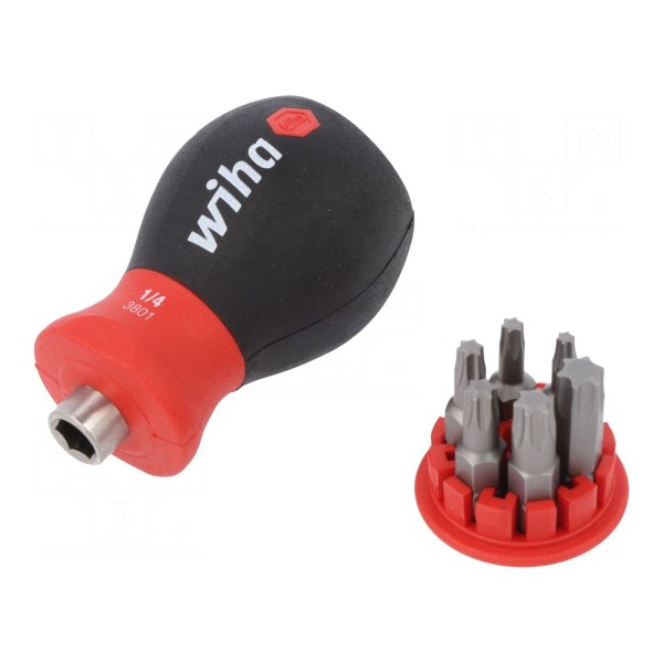 Wkrętak uniwersalny z serii STUBBY to kompaktowe narzędzie wyposażone w magazynek bitów typu Torx. Zestaw zawiera sześć końcówek w rozmiarach TX10, TX15, TX20, TX25, TX30 oraz TX40, które są przechowywane wewnątrz rękojeści. Uchwyt narzędzia dostosowany jest do standardu D6,3mm (1/4") i posiada wbudowany magnes, co ułatwia mocowanie grotów.