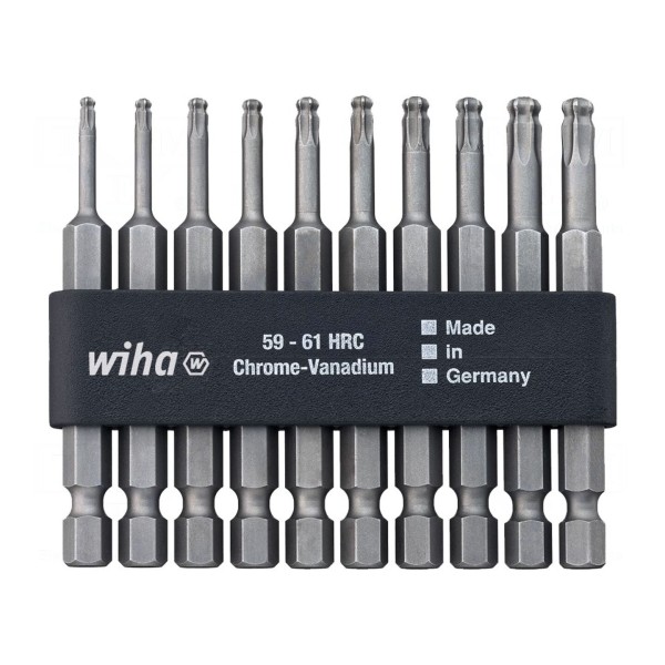 Zestaw zawiera dziesięć hartowanych końcówek wkrętakowych typu Torx, wykonanych ze stali chromowo-wanadowej. Elementy te charakteryzują się kulistym kształtem grota, co umożliwia pracę pod kątem w trudno dostępnych miejscach.
