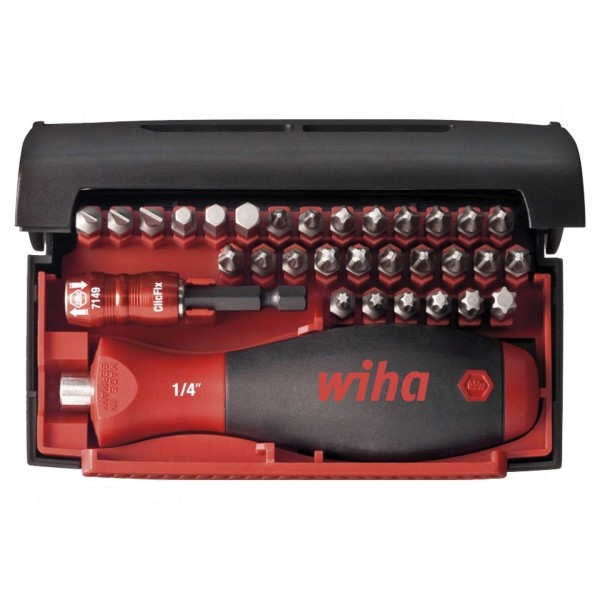 Elementy zestawu wyposażono w uchwyt o rozmiarze C6,3mm, który jest kompatybilny z gniazdami 1/4". Narzędzia dostarczane są w pudełku, które ułatwia przechowywanie i organizację poszczególnych końcówek. W zestawie znajduje się również rękojeść wkrętakowa.